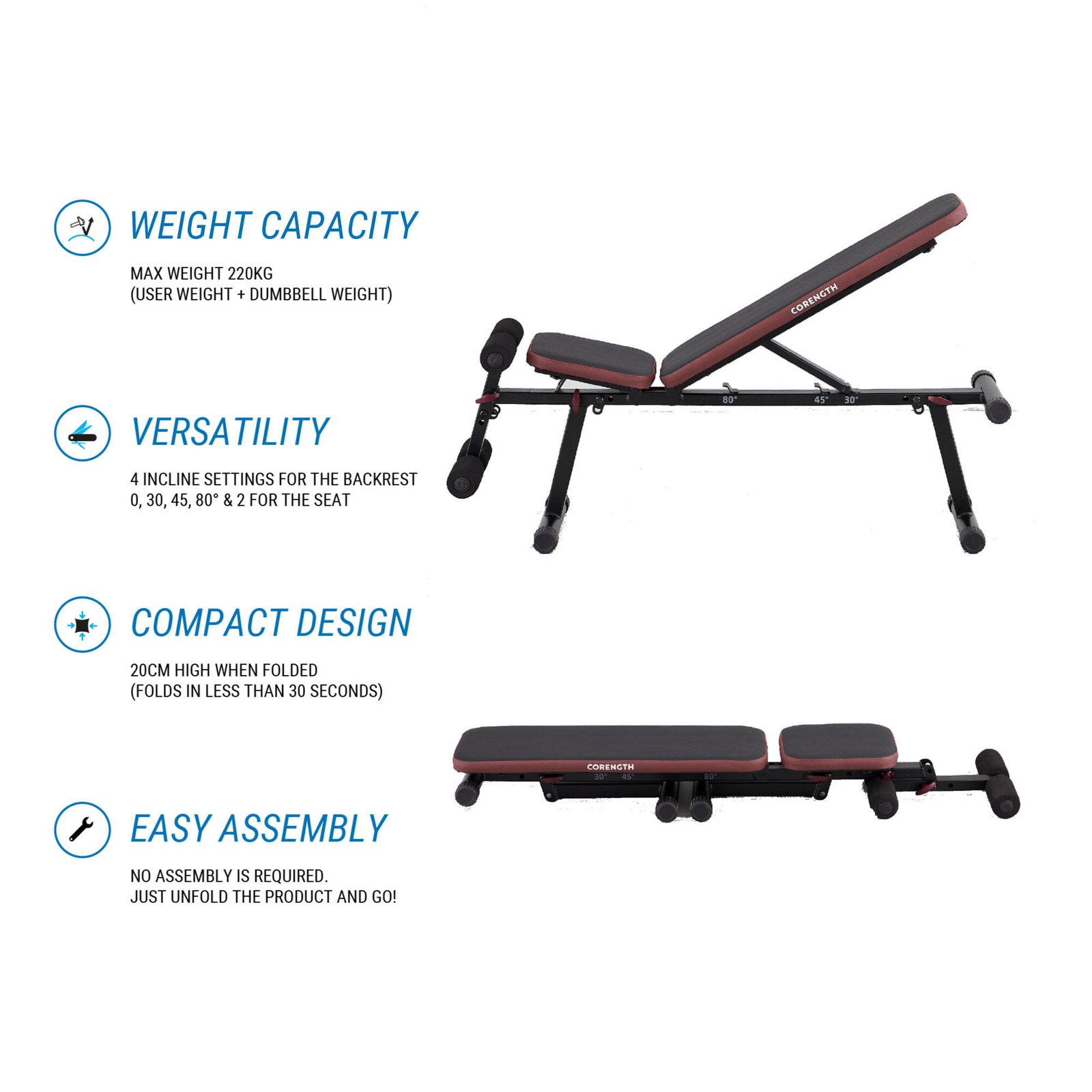 | Start training as soon as you receive your weights bench | Don’t have time to assemble a weights bench? The 500 bench is already assembled in its box. And of course it folds easily for storing under furniture or in a closet. |